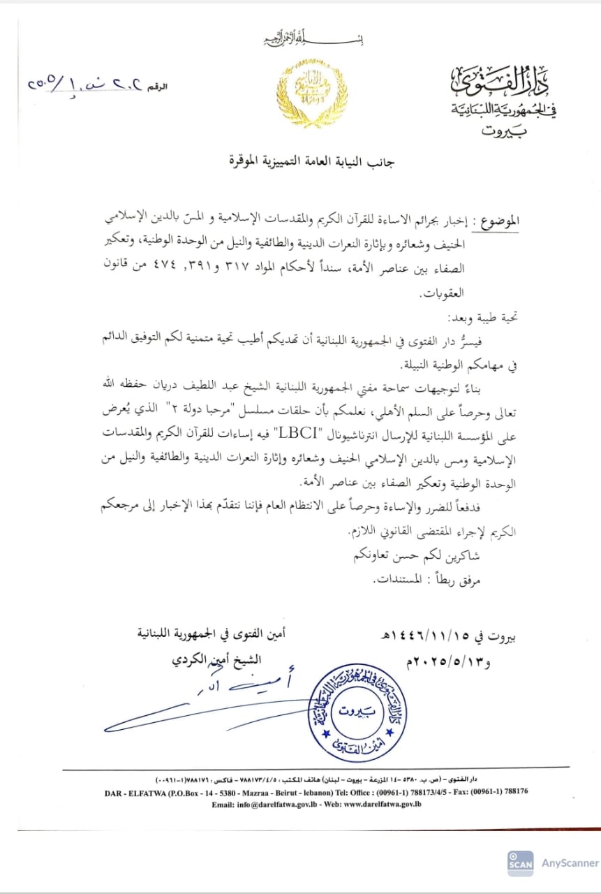 بناءً على توجيهات مفتي الجمهورية اللبنانية الشيخ عبد اللطيف دريان، ادّعى أمين الفتوى في الجمهورية اللبنانية الشيخ أمين الكردي أمام النيابة العامة التمييزية عبر كتاب رسمي تضمّن إخبارًا بجرائم الإساءة للقرآن الكريم والمقدسات الإسلامية، واتهام صريح بمسّ الدين الإسلامي وشعائره، إضافة إلى إثارة النعرات الطائفية وتهديد الوحدة الوطنية، وذلك استنادًا إلى المواد 317 و391 و474 من قانون العقوبات اللبناني.
