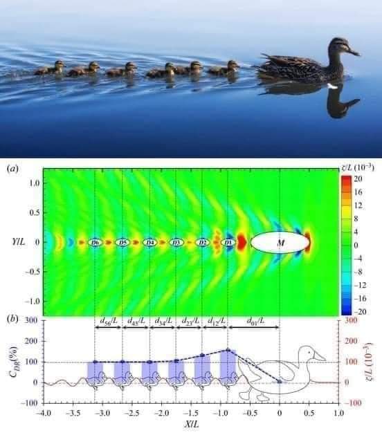 تقوم الأم بكسر التوتر السطحي للماء و خلق موجات دافعة للأبناء عبر ركوب الأمواج و تمريرها للأبناء لخلق سحب موجي و توازن ديناميكي لهم …. ، و بالتالي تسهيل عملية السباحة لفراخ البط و تقليل طاقتهم المستهلكة في السباحة …… ، 🍁